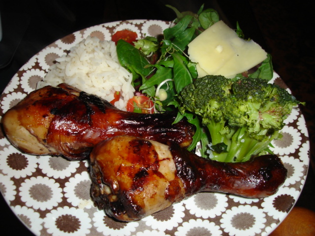 焼いたチキンとサラダとごはん。